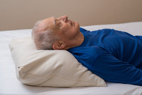In this picture, Art's pillow has too much buckwheat in the center. His shoulders lay on top of the pillow, so the buckwheat hulls aren't actually giving good support of his neck. He should move some hulls so his neck is receiving support and his shoulders are resting on the mattress.